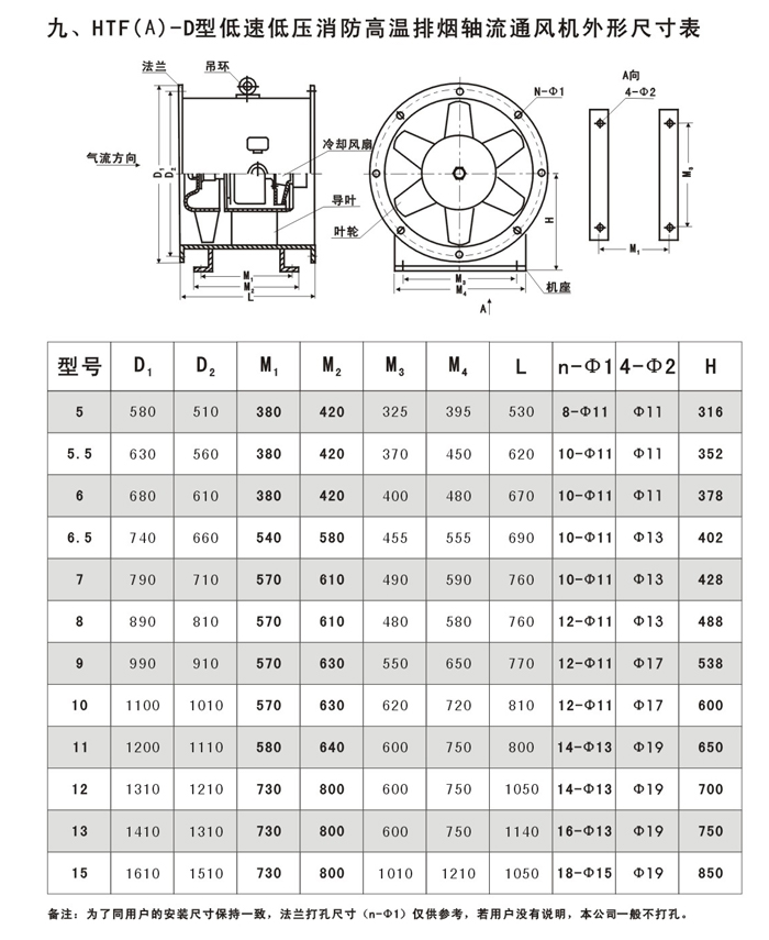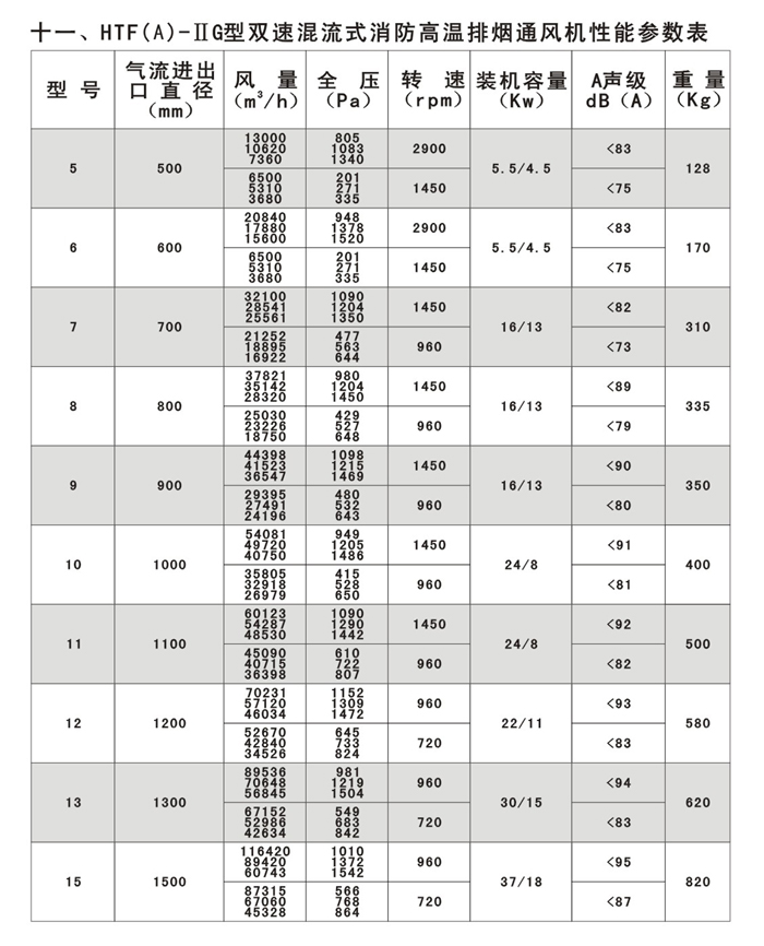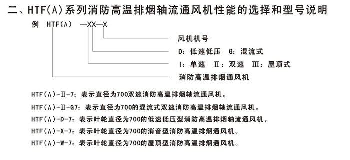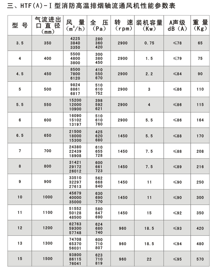 1. HTF(A)系列消防高溫排煙軸流通風機,其基本形式為軸流式結構,采用耐高溫電機,配有專門的電機冷卻系統。具有性能優良、耐高溫性能良好、效率高、占地比離心風機少、安裝方便等特點。
