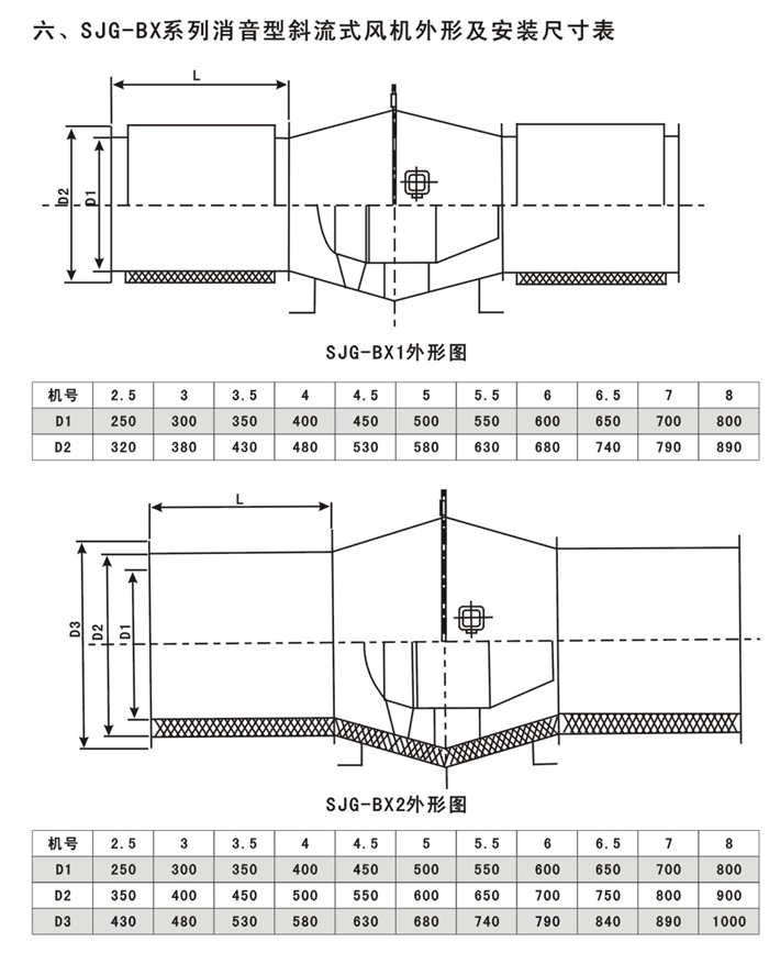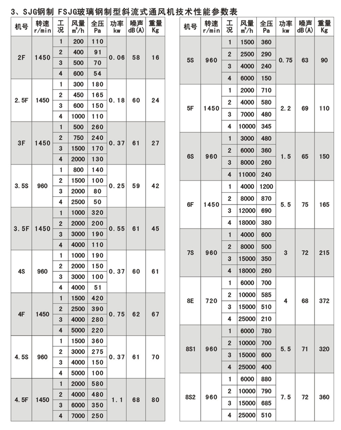 SJG系列斜流式通風機按葉輪直徑分為200-800mm十幾種規格、十幾個機號,風量由200-2500m3/h,全壓由50-1200Pa;具體數據請查風機性能參數表。