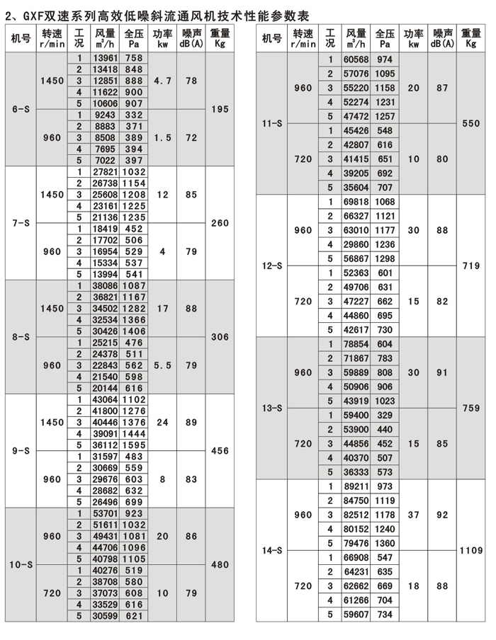 GXF系列斜流通風機按葉輪直徑分為400-1400mm十四規格,按類型分為A、B、C、D、S五種類型,共五十八個機號。風量由3000-90000m3/h,全壓由185-2500Pa;這樣就給設計部門和用戶單位提供了充分的選擇條件,具體數據請查風機性能參數表。