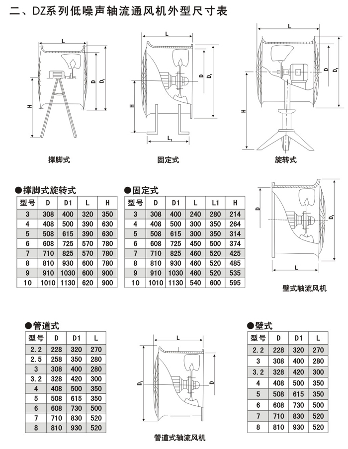 特性及應用 Dz系列通風機采用從聲源入手,低轉速,高壓力系數的設計方法,研制成寬葉片,大弦長,空間扭曲傾斜式葉型,配用風機專用電機,具有明顯的噪聲低,風量大,耗電省,振動小,外形美觀等優點,是一種高效,節能型軸流風機。廣泛適用于廠房,倉庫,辦公室,住宅等場所的壁式排風,管道送風。 本系列風機有三種型式::DZ-11型壁式,DZ-12型崗位式,ZD-13管道式。特殊場合按用戶要求可加式成網罩,彎頭或自垂百葉形式工。 本系列風機一般配用三相電機,按用戶要求對0.55KW以下可配用單相電機。可根據輸送介質要求制成防腐,防爆型:FDZ為防腐型軸流通風機,用于輸送有腐蝕性的氣體;BDZ為防爆型軸流通風機,用于輸送易燃易爆的氣體。FBDZ為防腐防爆型軸流通風機,用于輸送有腐蝕性且易燃易爆的氣體。![]() ![]() |