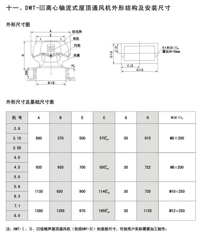 一、特點 1.型式規格多,應用范圍廣:可根據使用場合的風量,風壓和噪聲的不同要求,選用以下型式的風機: 軸流式屋頂通風機:代號為DWT-I型,具有風量大,壓力較離心式風機的特點。同時根據用戶要求還可設計成雙向旋轉可逆式,具有正反式況等效的特點。 2.效率高噪聲低本風機系采用先進的CAD系列軟件,經多目標優化設計開發。本系列風機中1200.1400.1500.1600.2000.及2400mm風機采用同值徑不同轉速,不同角度改變幾量.風壓的方法,以滿足不同使用工況的需要,達到風機與系統匹配,以利實現節能和降低噪聲; 3.質輕。高強。耐腐蝕;風機葉輪可根據工作空氣介質不同的腐蝕性而采用不同的材質,分別有ABS(工程塑料)FRP(玻璃鋼)和鋁合金板材制作,對于壓力要求高,風機轉速較大的離心風機,葉輪表面較特殊的鍍鋅加噴塑耐蝕處理,不僅降低整機重量且有良好的耐腐蝕能力; 4.運轉平穩,壽命長;本風機的轉動慣量小,動平衡精度高,運轉平穩,各項性能指標的工廠內控標準要求均高于風機待業標準,能確保風機長期穩定地運行; 5.適用面廣:本風機可以根據使用要求,制造成防爆型,阻燃型,適用于抗老化,抽送易燃易爆及有腐蝕性氣體的場合; 6.外型美觀:本風機的風帽部件采用玻璃鋼制作,外表采用進口膠衣樹脂膜,曲面過渡柔和,美觀大方,實用性強;也可根據用戶要求制成鋼風帽經鍍鋅噴塑(PVC)處理; 7.使用條件:介質溫度不超過60攝氏度,氣體中不允許含有過量粘性物,含塵量小于100mg/m。對介質溫度高的場合,我廠有高溫風機技術可提供產品使用。 8.本產品經浙江省產品技術監督所檢測合格,檢測項目含阻燃,導電性能,防爆,抗風性能等,由市產品技術監督局監制。二、型號結構說明 1.軸流式屋頂風機直徑自300-2400mm,供十七種機號,離心式屋頂風機有300-1000mm九種機號。還可根據用戶需要提供其它機號的風機; 2.各種型號的風機結構可參閱總裝圖,它由葉輪,風筒,風帽,傳動部件,活頁風門,防鳥網,安全網等部件組成;(以上配置,按用戶要求制作) 3.風機傳動形式:DWT-1型風機直徑<_2200mm采用電機直聯傳動,2200mm以上風機采用皮帶傳動形式,也可根據客戶要求采用減速器傳動形式,活頁風門有重力式,電動式和手動式三種。 4.屋頂風使用范圍廣且數量大,根據用途的需要結構形式繁雜,本廠可按用戶不同的技術要求,進行研制開發,并對外形結構進行改進。![]() ![]() ![]() ![]() ![]() ![]() ![]() ![]() |