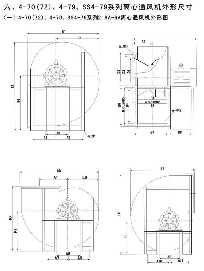 4-72,4-79,SS4機-79系列離心風機作一般通風換氣用,輸送空氣或其它不易燃易爆,無腐蝕性的氣體,氣體內無粘性物質,所含的塵土及硬質顆粒物不大于150mg/m3,溫度不超過80攝氏度。