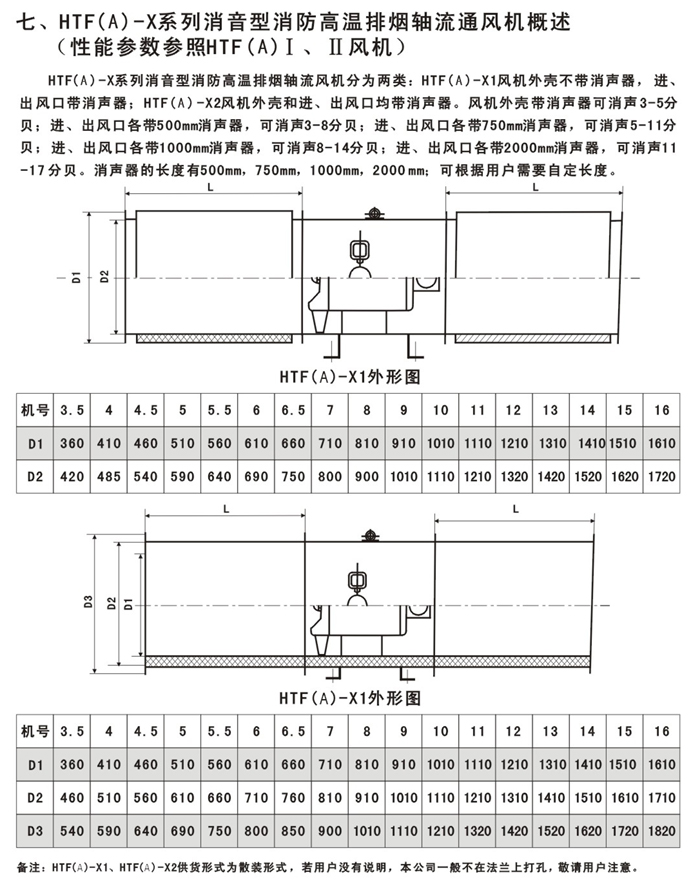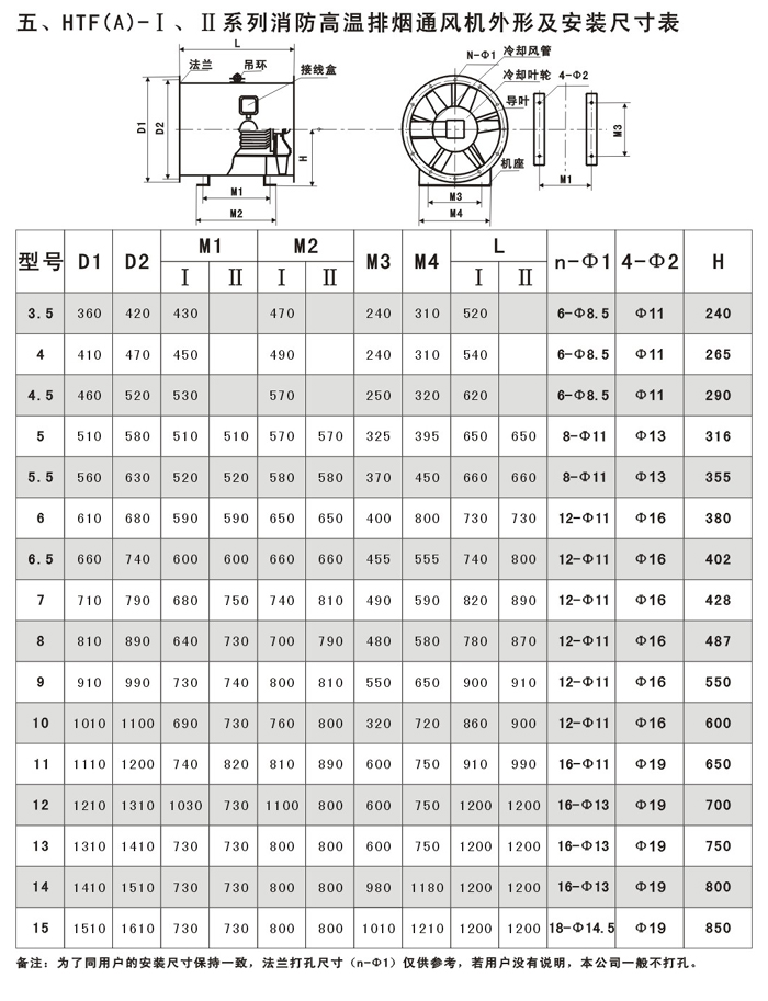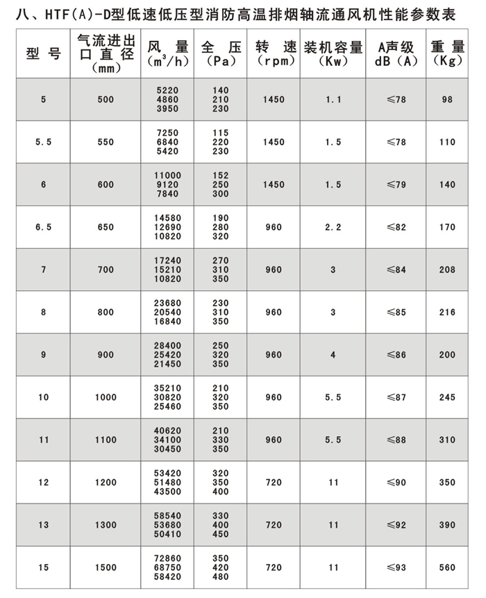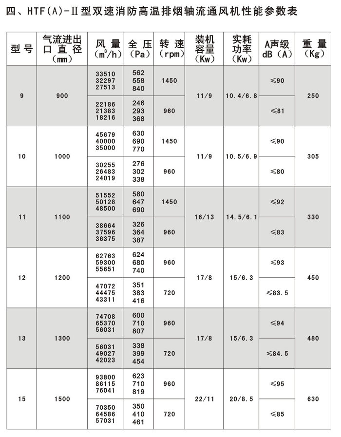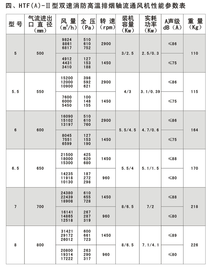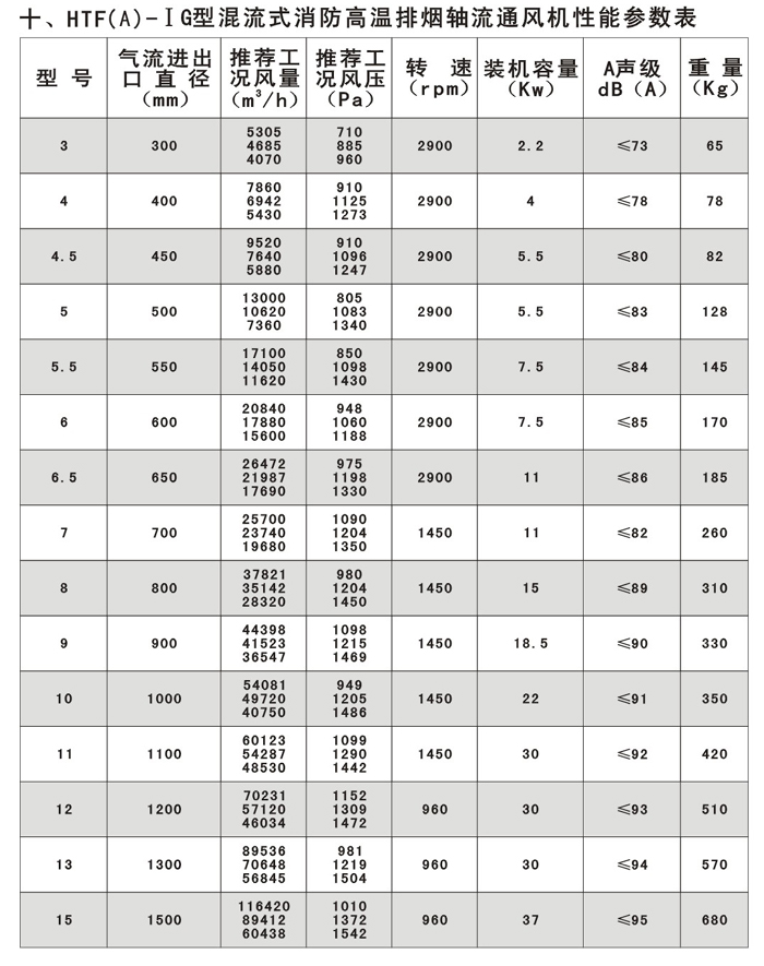 1. HTF(A)系列消防高溫排煙軸流通風機,其基本形式為軸流式結構,采用耐高溫電機,配有專門的電機冷卻系統。具有性能優良、耐高溫性能良好、效率高、占地比離心風機少、安裝方便等特點。