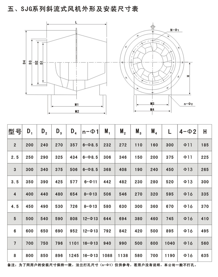 SJG系列斜流式通風機按葉輪直徑分為200-800mm十幾種規格、十幾個機號,風量由200-2500m3/h,全壓由50-1200Pa;具體數據請查風機性能參數表。
