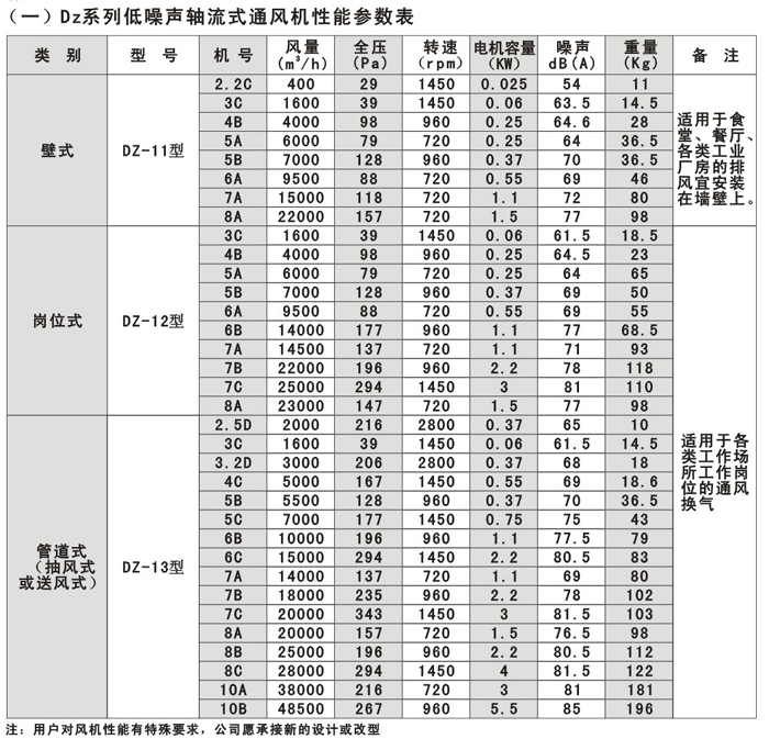 特性及應用 Dz系列通風機采用從聲源入手,低轉速,高壓力系數的設計方法,研制成寬葉片,大弦長,空間扭曲傾斜式葉型,配用風機專用電機,具有明顯的噪聲低,風量大,耗電省,振動小,外形美觀等優點,是一種高效,節能型軸流風機。廣泛適用于廠房,倉庫,辦公室,住宅等場所的壁式排風,管道送風。 本系列風機有三種型式::DZ-11型壁式,DZ-12型崗位式,ZD-13管道式。特殊場合按用戶要求可加式成網罩,彎頭或自垂百葉形式工。 本系列風機一般配用三相電機,按用戶要求對0.55KW以下可配用單相電機。可根據輸送介質要求制成防腐,防爆型:FDZ為防腐型軸流通風機,用于輸送有腐蝕性的氣體;BDZ為防爆型軸流通風機,用于輸送易燃易爆的氣體。FBDZ為防腐防爆型軸流通風機,用于輸送有腐蝕性且易燃易爆的氣體。![]() ![]() |